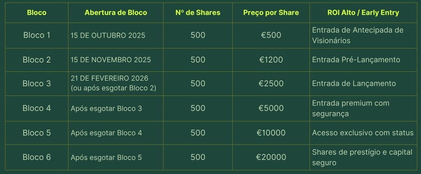 Nunca mais vais conseguir entrar com este preço por share. No próximo bloco, o valor DUPLICA e o teu retorno por euro investido cai para metade.
